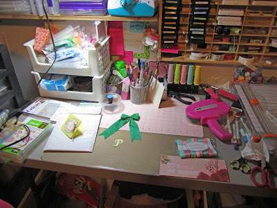 My birthday is this Saturday, so got my first gift laying there on the table too, a pedicure gift certificate woohoo!! Gotta love those! I look forward to doing that very soon. Let's see oh and the green ribbon there is for a pin I am making for a friend's daughter. Once the glue dries for the pin part, that letter P there will go on the other side right in the center of the bow. Her name is Patty, hence the P. Plus I made it green in case she wanted to wear it for St. Patty's day! hehehe ok, she might! The little note I am including and the mailer are sitting there with it, oh looks like I didn't put up the cartridge yet I used for it either.